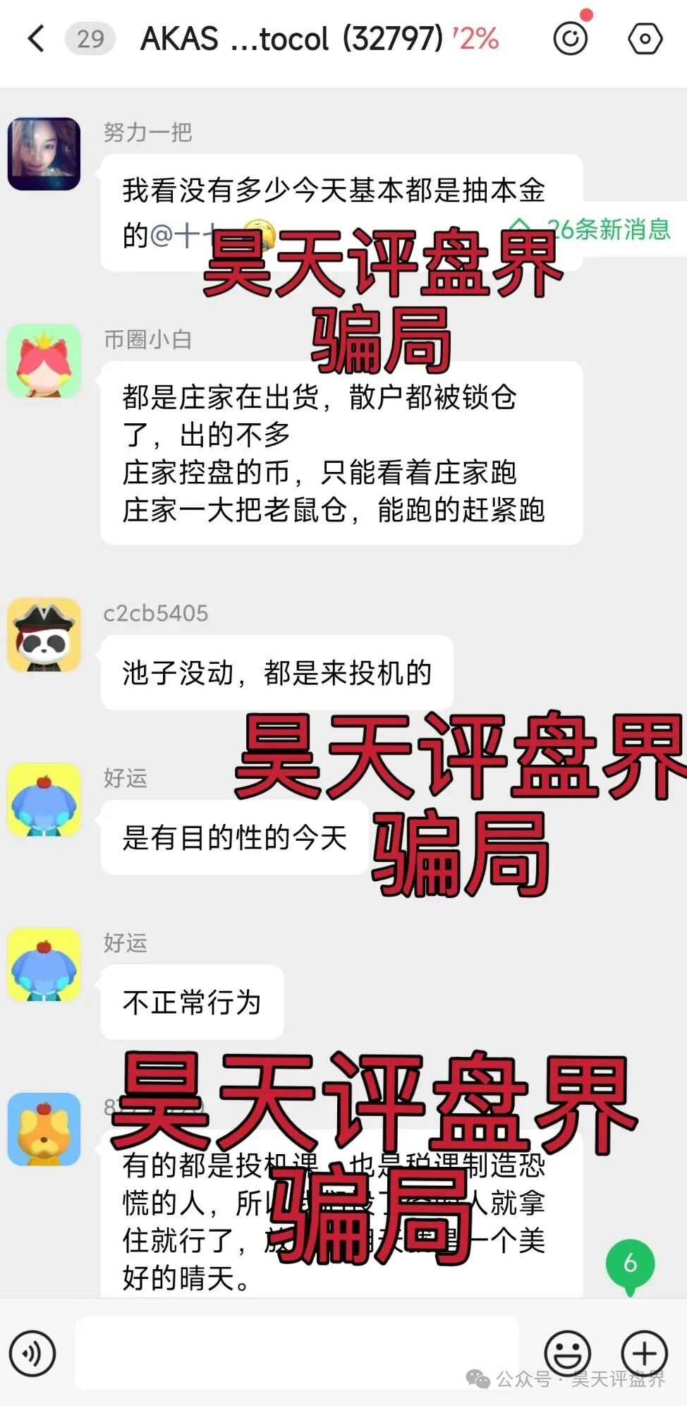 昊天评盘界:AKAS这个质押分红类资金盘骗局,昨天昊天就预警的时候说了,部分团队已经撤离,昨天上午后台还有骂昊天的,下午诈骗团伙就开始疯狂砸盘了,截止到发稿前直接跌了26%,操盘手人...