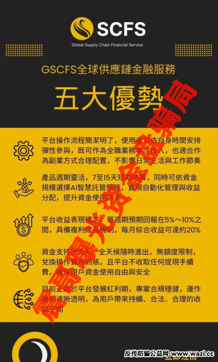 最近有个叫SCFS的项目在圈子里传得挺火,说什么AI智能匹配订单、稳定币躺赚,搞得跟真事儿似的。震哥今儿就给大伙儿扒扒这玩意儿到底靠不靠谱。 先说说他们那套忽悠人的话术:注册成服务商...