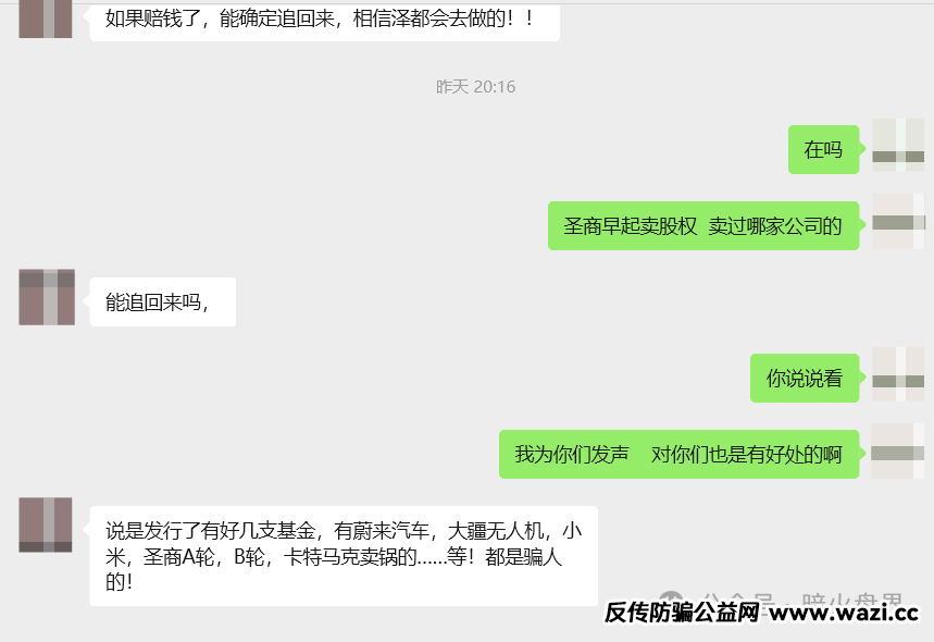 圣商早期卖股权,对外宣称卖的是蔚来汽车、大疆无人机、小米、卡特马克,圣商自己的A轮、B轮等等。很多人投了一次又一次,拉朋友入场投资买股票,最后都没有得到收益!目前小诺的账号后台,私信留言,很多受害者在控诉圣商!一位受害者甚至说,投资人因为没有钱出资,圣商竟然可以辅助其做贷款,网贷。总而言之就是要把投资人身上的每一分钱撸干!