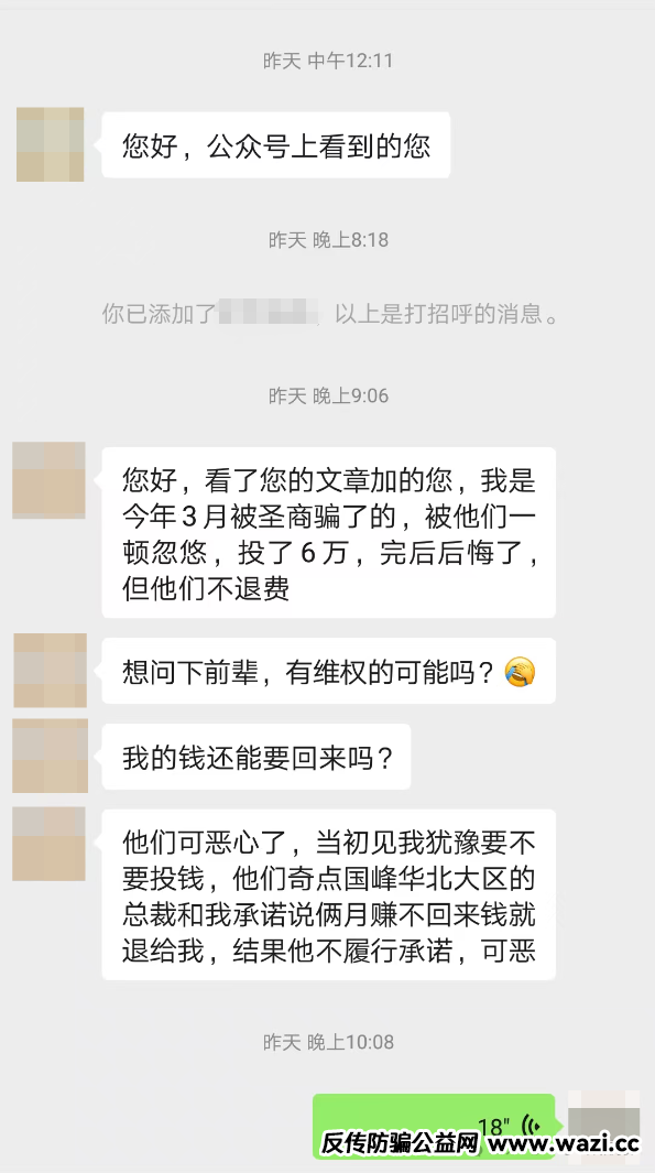 来今天不想再写关于圣商的情况了,但是因为前几篇文章的原因后台太多人留言了。很多人都是向咨询小编有没有拿回投资款的方式,或者维护自己合法权益的方法。对于这些圣商投资人的求助,小编表示理解。经了解这些网友的投资一般都在5万以上,多的几十万的也有。