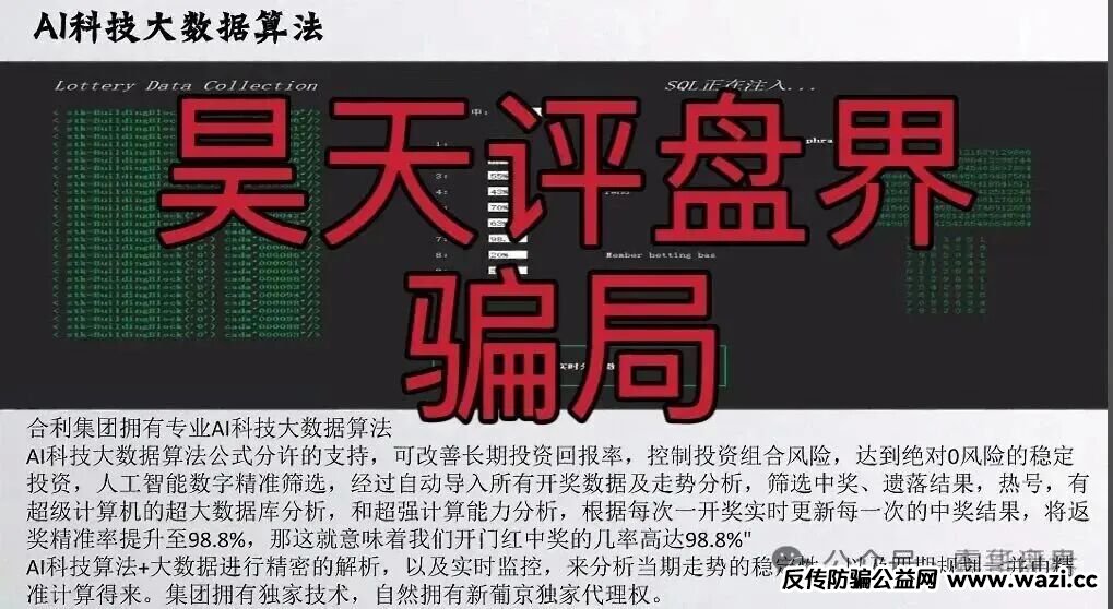 家人们,最近震哥在后台又收到粉丝爆料,合利集团搞了个彩票带单资金盘,打着AI大数据、高精准中奖率的幌子,忽悠人投钱。其实套路还是老一套,什么“绝对零风险”“98.8%中奖率”,吹得天花乱坠,结果就是个拉人头、割韭菜的杀猪盘。