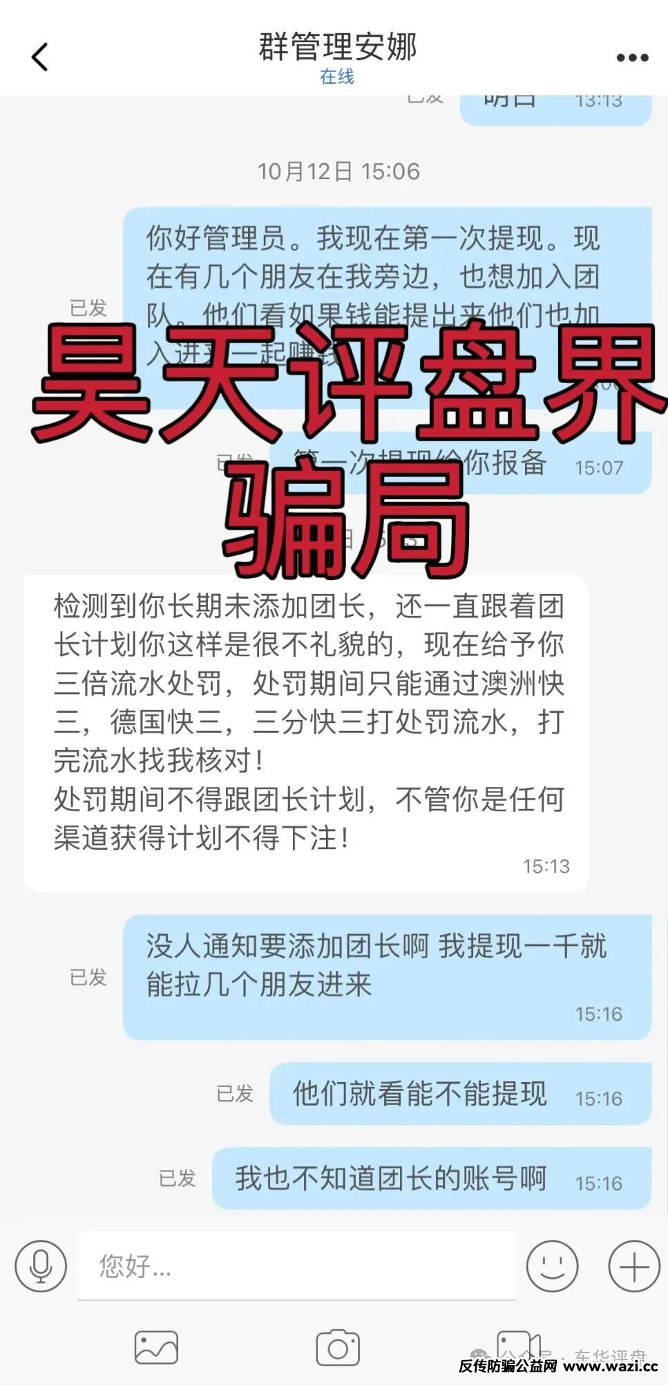 昊天评盘界:万利国际这个彩票类资金盘骗局,昊天也是曝光过2次了,此盘基本上是每个月都会单割一部分会员,他们就是以群里带单打彩为幌子让你下注。赚钱了就不让你提现。以各种方式说你违规。大家擦亮眼睛,群里全都是骗子,前天又单割了几个团队,你被割了吗?