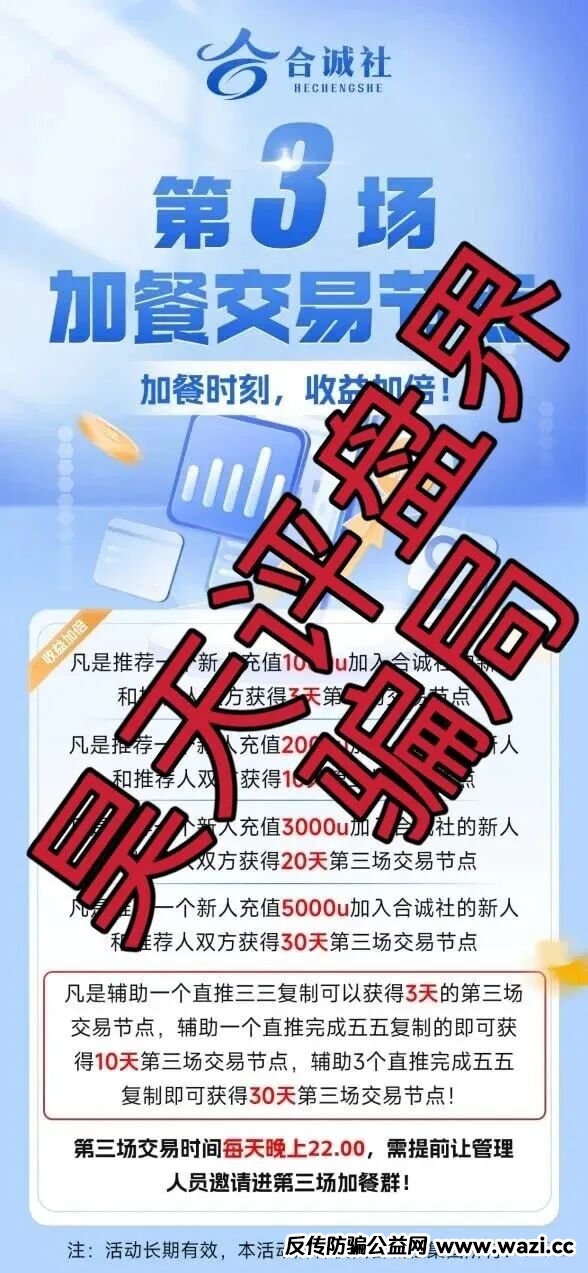 昊天评盘界友情提醒:合诚社又一个跟单类资金盘骗局,典型的一轮圈杀猪盘,看见一定要远离!近期知乎,小红书,微博,抖音等app都有冒充昊天的诈骗团伙,记住了我们不做项目,更不会去推广任何项目,除公众号外其他一律不是本人,切勿上当受骗!