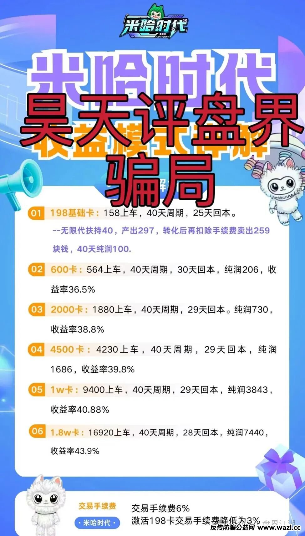 昊天评盘界:近期不少粉丝爆料了一个叫“米哈时代”的分红类资金盘骗局,9.25号开盘的玩法有6档价值198~1.8w不同的卡,不过大部分玩家应该都是上600档位的卡,40天周期,30天回本,每天分红的收...