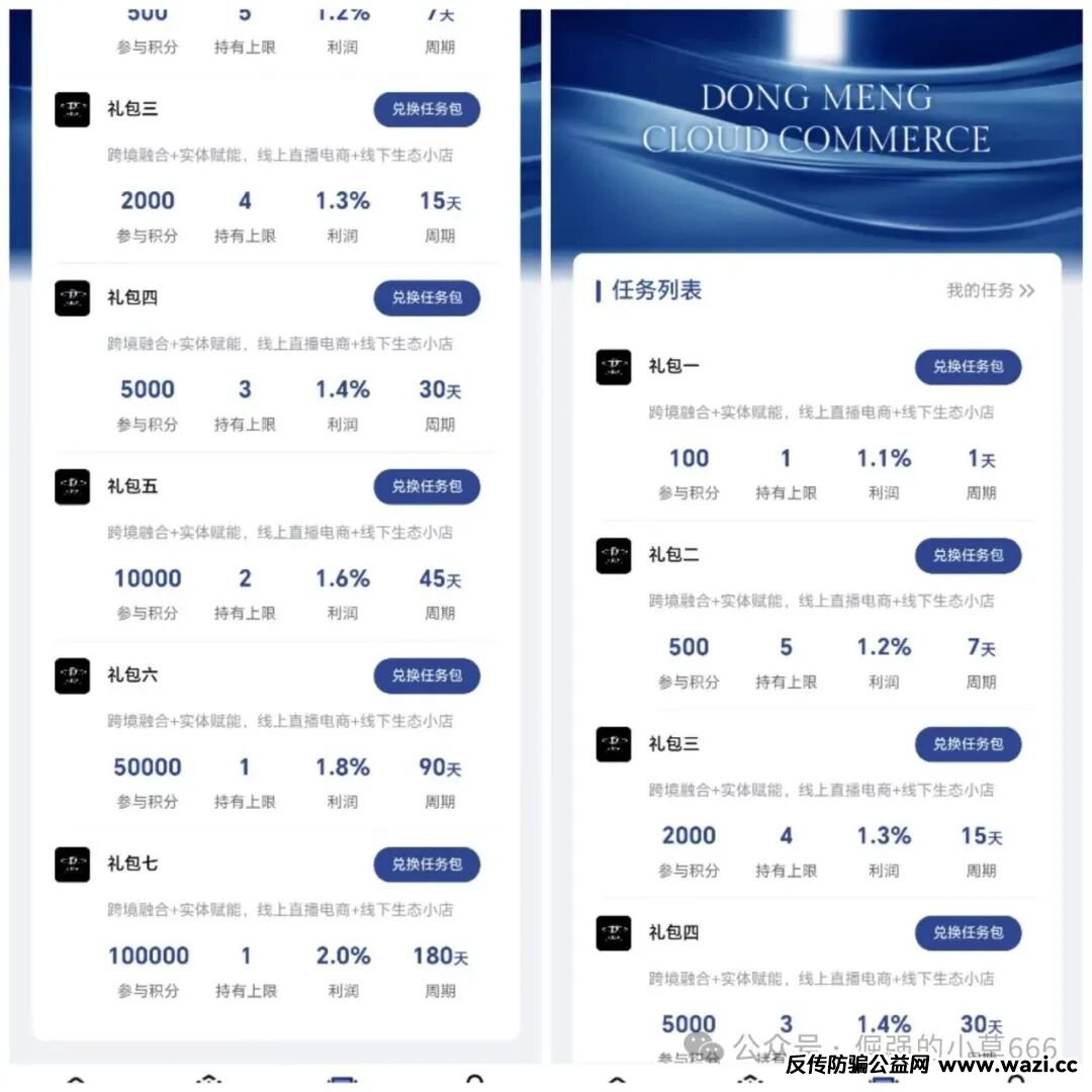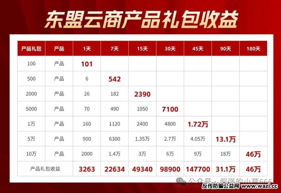 如今,“东盟云商”又来了,而且玩得更狠。它一口气推出7个等级礼包:100元、500元、2000元、5000元、1万元、5万元、10万元,对应的日收益率也层层加码:1.1%、1.2%、1.3%、1.4%、1.6%、1.8%,最高甚至达到2.0%!越投越多,收益越高,诱惑你不断加码,直到掏空所有积蓄。