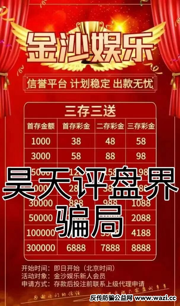 昊天评盘界:近期不少粉丝给昊天爆料了一个叫金沙娱乐的彩票跟单类资金盘骗局,据知情人爆料此盘目前开盘有几个月了又冒充新盘开始各种推广拉人,前天也是单割了一部分会员,加上部分团...