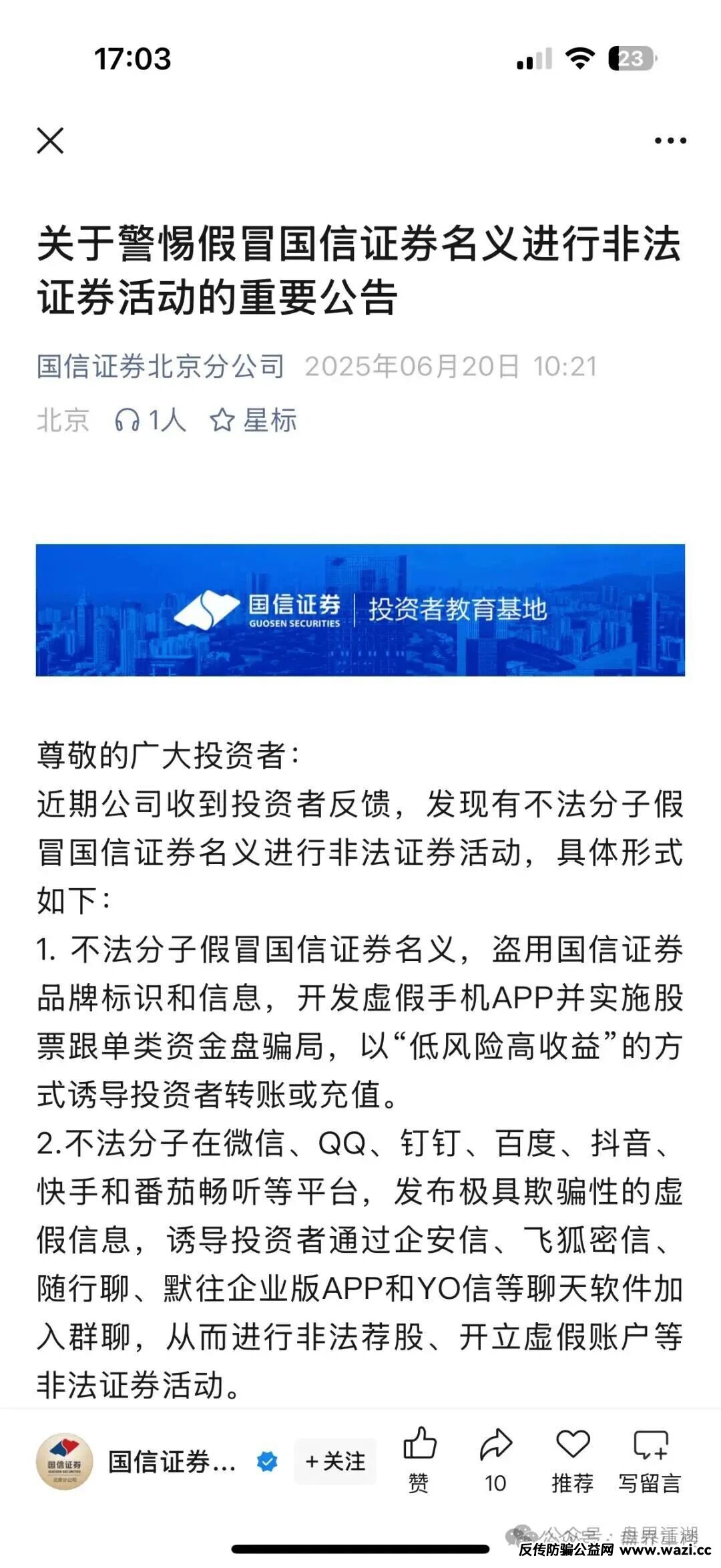 这次的股票导师又换成了林逸,国信证劵早就发过声明了,现在不少冒充他们的诈骗团伙,希望大家能仔细甄别...