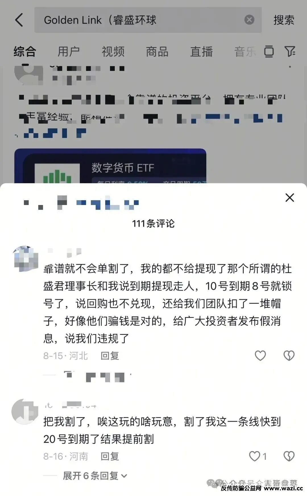 2025/10/17Golden Link(睿盛环球)这个资金盘震哥上个月就曝光过,这是个境外诈骗项目。当时已经出现单割、提现困难、随意封号的情况。 现在骗子开始疯狂投诉删文章了。懂的都懂,之前云上城那...