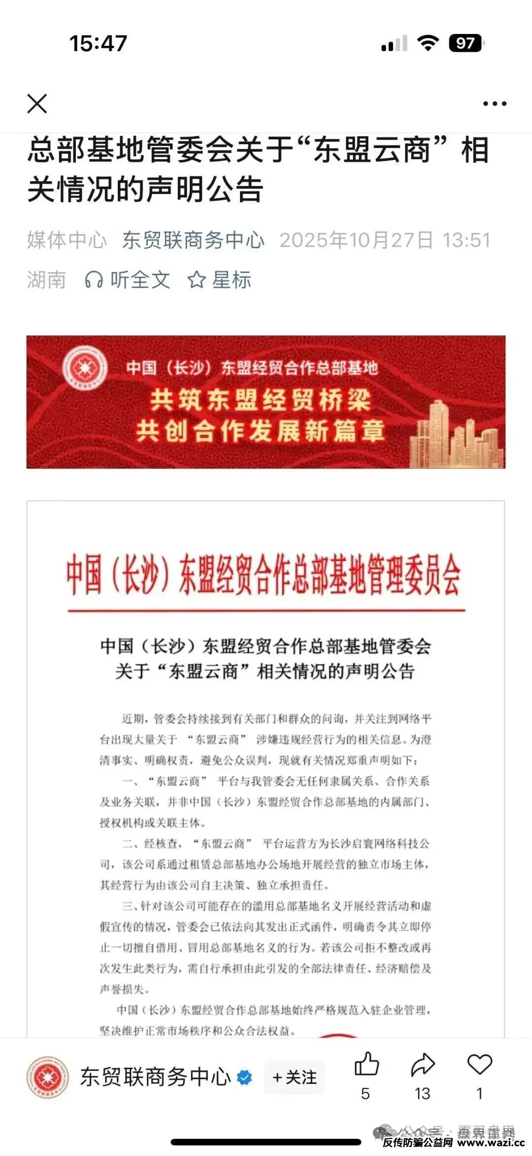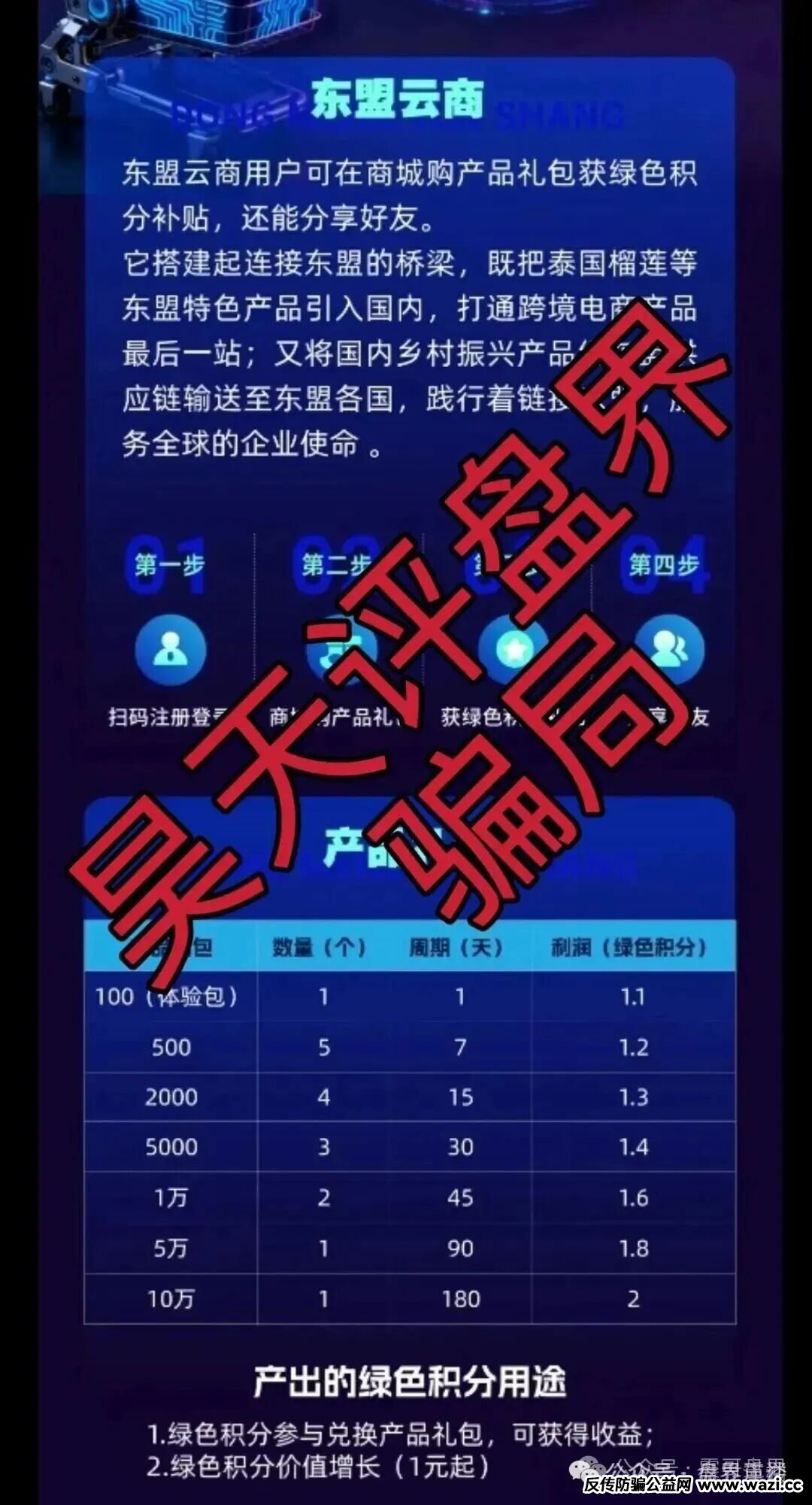 近期不少粉丝爆料了一个叫东盟云商的互助分红类资金盘骗局,十月十六号才开盘。它打着跨境电商的旗号,说自己在做中国和东盟的贸易。包装的其实就是跨境电商平台,10月16日开盘的,和之前重楼曝光跑路的“唯遗”一样的模式,私募合伙人1.2万得1万产品礼包,5.5万合伙人得5万产品礼包,每日1.6%奖励,随时跟“唯遗”一样直接拔网线跑路,属于典型的一轮圈杀猪盘,大家看见一定要远离…