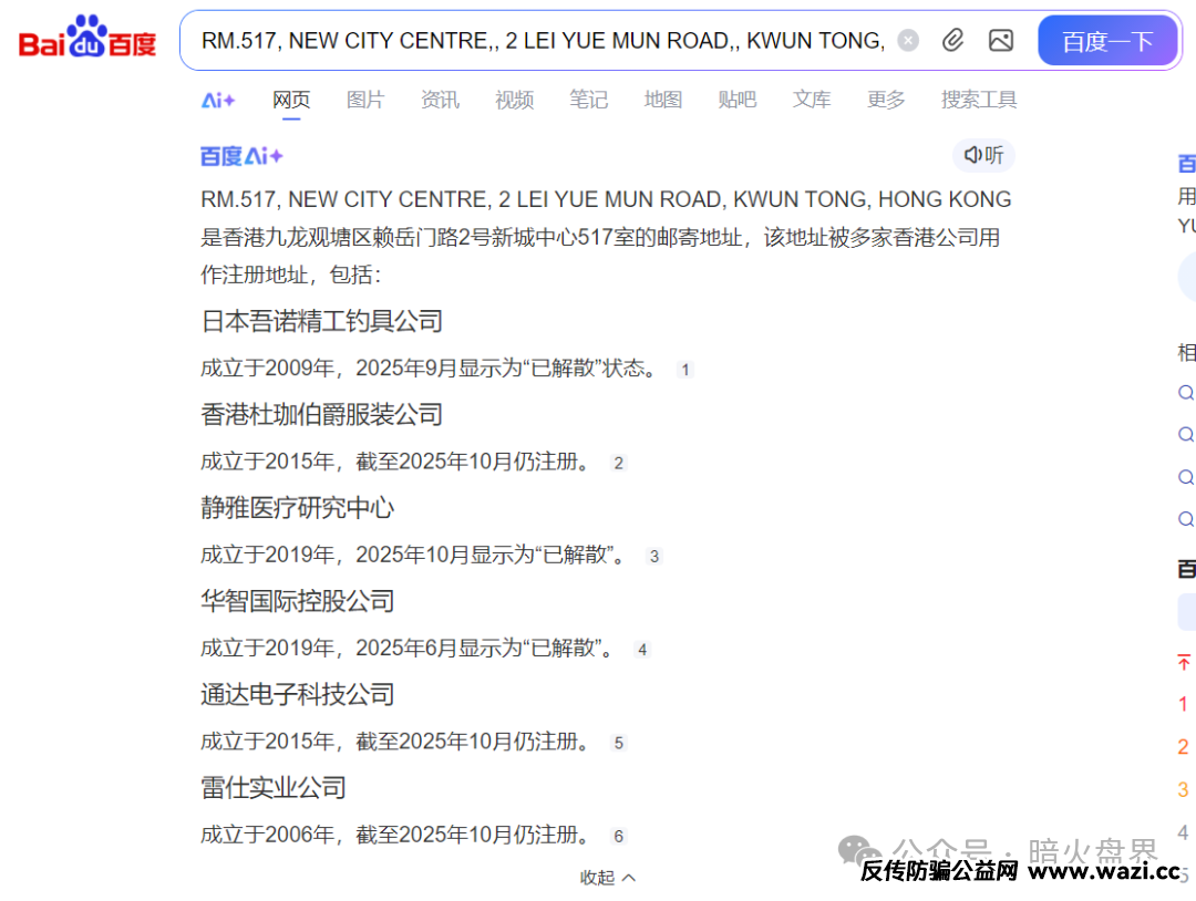 下面是小诺在天眼查中分别查询了“新晃德懋”、“怀化德懋”、“香港德懋控股”三家公司相关情况截图。不难看出新晃和怀化公司的实际控制人都是一个人。而小诺在通过百度搜索这家港资公司的办公地点,更是令人感到疑惑。同一个门牌地址注册了好几家公司,并且已经有多家公司处于解散状态了。我相信各位网友也做过生意,租过写字楼,同一楼层,会有不同隔间租给不同的租户,但是物业会给每一个隔间设立有单独的编号,是为了方便物业管理以及租户收发快递和信件的。我们看到这么多业主租在写字楼同一层的一个办公室里,难免不让人怀疑这是一家皮包公司。