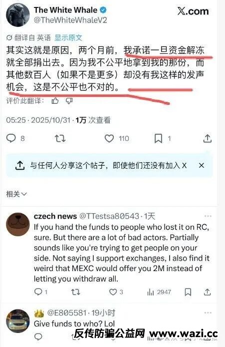 最近事情的起因是:英国有个名叫白鲸的kol在抹茶盈利了300万美元,而抹茶不让提现。