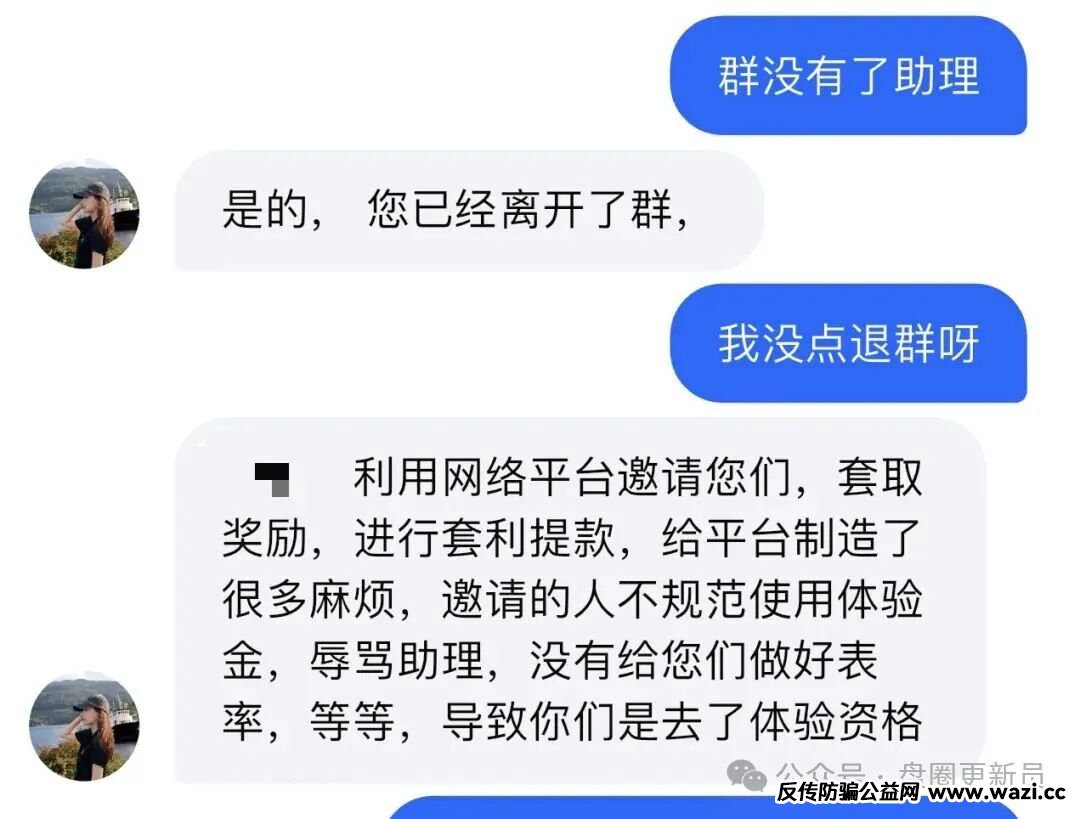 前几天曝光的星运国际cp诈骗盘,最近也是开始套路了,前期通过赠送体验金引流的部分玩家,在疯狂洗脑还是不充值的情况下,已经开始被骗子踢出群,冻结账号。 骗子给出的理由是因为推荐人...