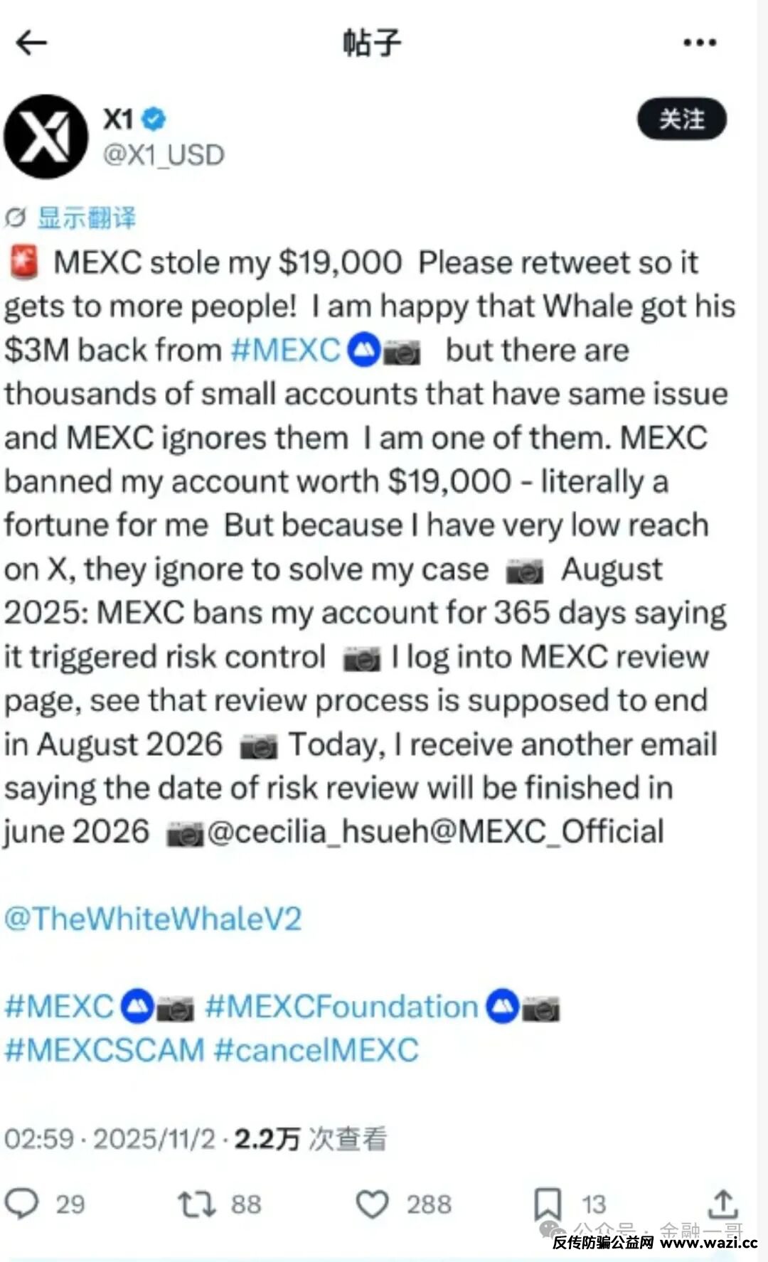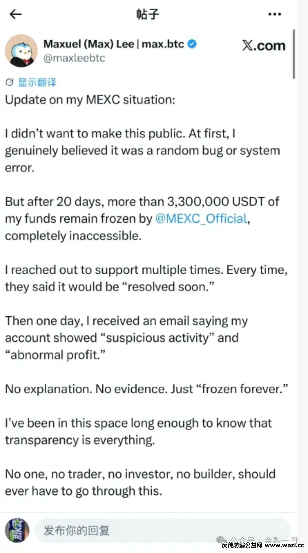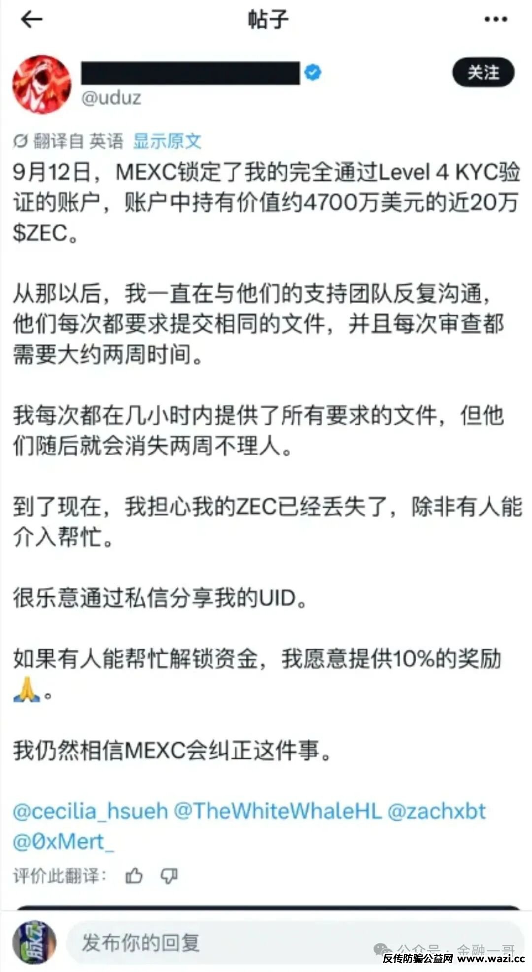 “抹茶MEXC”交易所陷入崩盘危机:一用户21.8万枚ZEC被MEXC冻结无法提现,价值超过9000万美金...