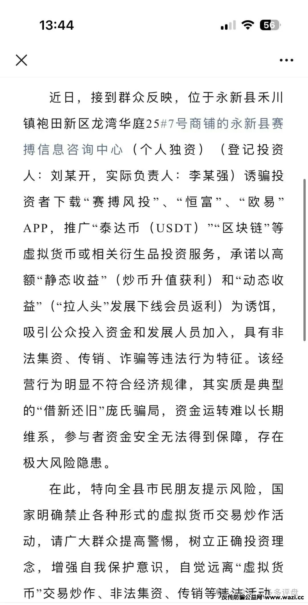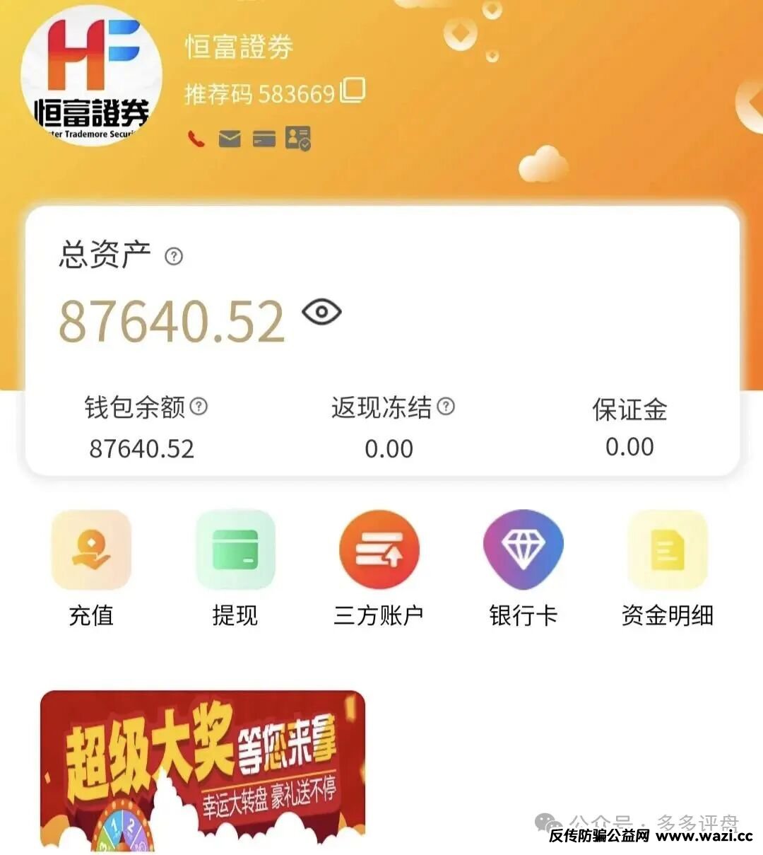 近期,多个渠道反馈所谓“赛搏风投(恒富证券)”的股票跟单平台存在重大诈骗嫌疑。该平台冒用正规券商资料包装骗局,通过高收益诱饵吸引投资者参与,实则采用典型的资金盘运作模式,现已出现频繁收割会员、无法正常提现等崩盘前兆......近期官方已经发布风险提示如下: