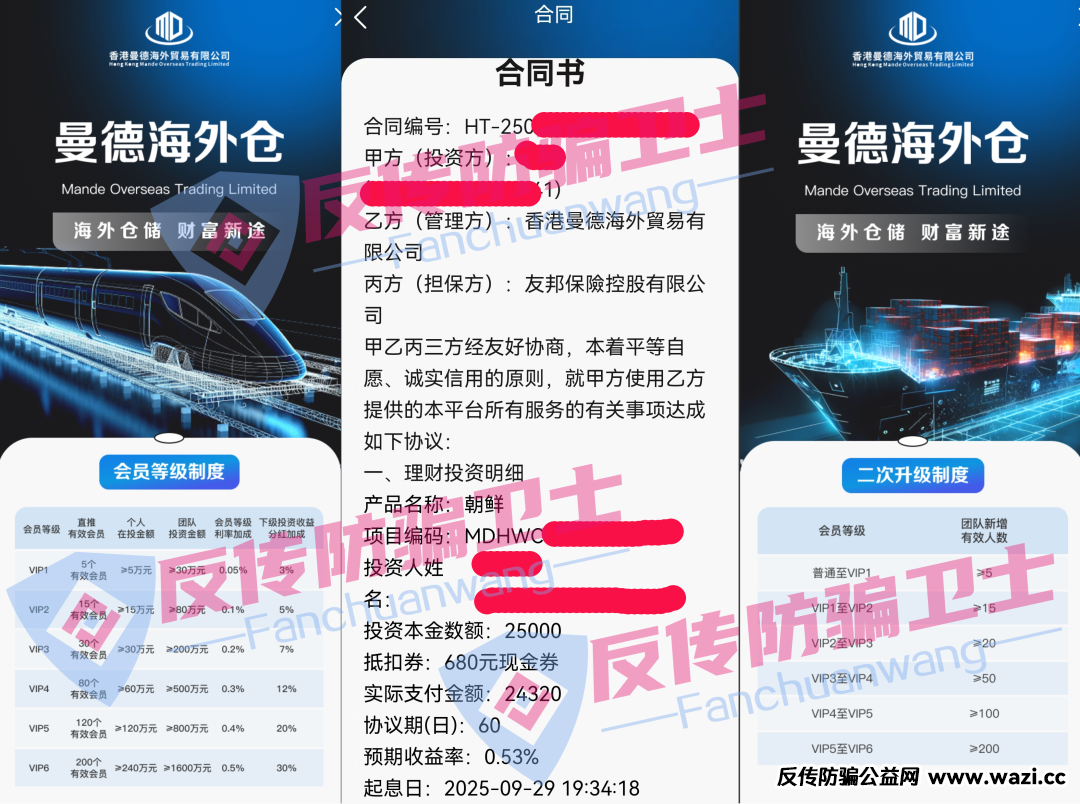 3、曼德海外仓:项目以 “海外仓储投资” 为噱头,虚构欧洲、亚洲多区域海外仓产品,承诺远超市场合理水平的固定收益(如比利时仓日收益 2772 元);伪造友邦保险担保函、编造 “全球资产备险金” 制度,谎称资金绝对安全以骗取信任;同时设计多级会员体系(普通会员至 VIP6),通过直推人数、团队投资金额设置升级门槛,配套直推奖励、等级分红、高额月薪(如 VIP6 月薪 20 万)等传销式激励,靠新投资者资金支付老用户收益,本质是庞氏骗局。一旦新入金不足,资金链断裂,参与者投入将血本无归。
