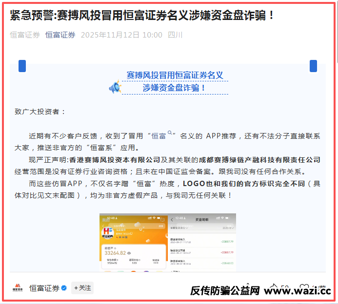 11月12日恒富证券微信公众号发文《紧急预警:赛搏风投冒用恒富证券名义涉嫌资金盘诈骗!》明确提醒:赛搏风投APP系假冒,是资金盘诈骗。