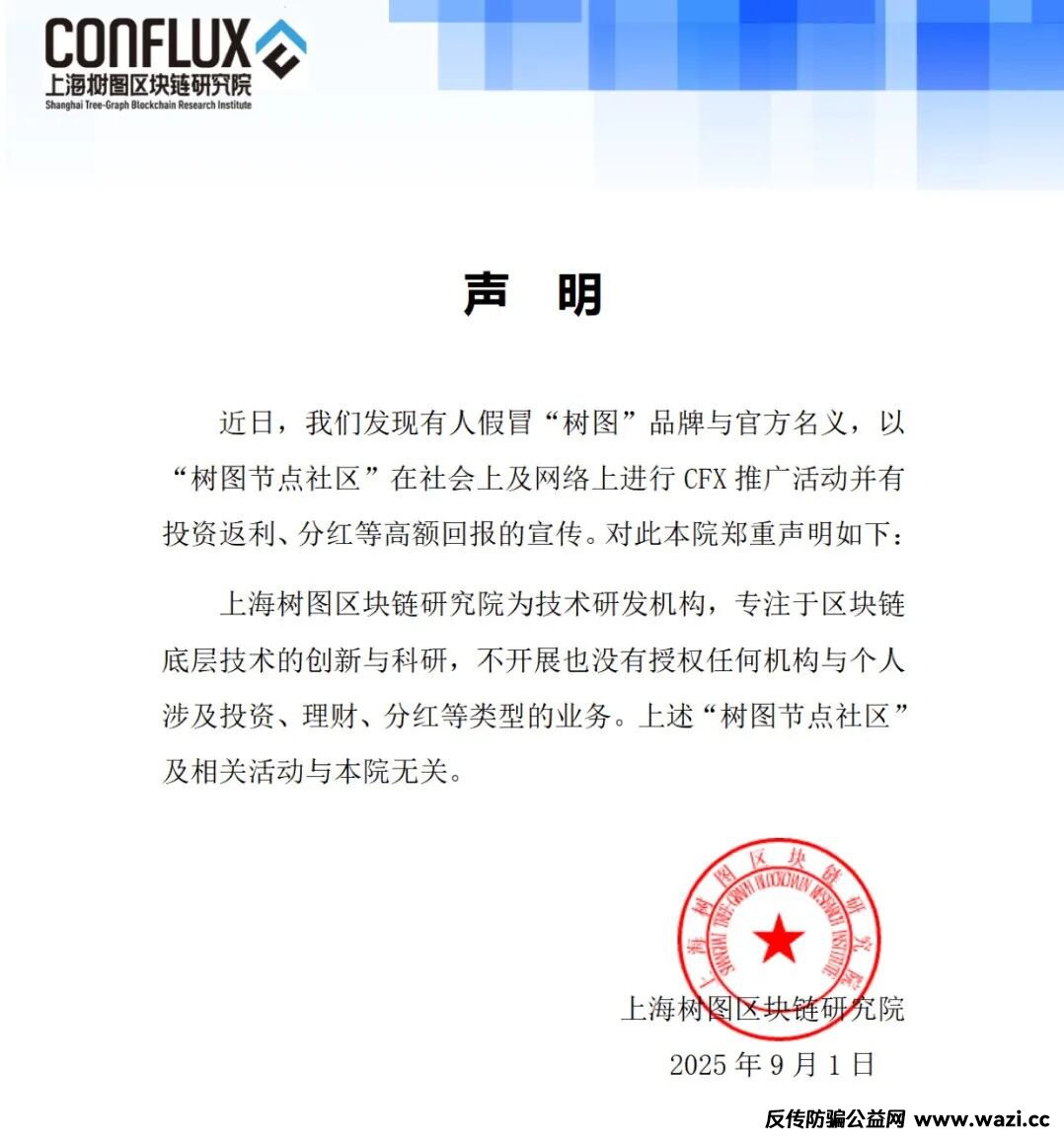 经核实,该所谓“树图节点社区”与Conflux 基金会不存在任何关系。Conflux 技术社区委员会郑重提醒广大社区成员:务必保持警惕,切勿轻信虚假宣传,以免遭受资产损失。