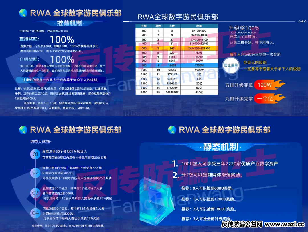 2、RWA全球数字游民俱乐部:以 Web3、DAO、智能合约为噱头,虚假宣称由新加坡、中东等基金会联合打造,通过 “三三复制” 传销推广模型,以直推奖、升级奖、领导人奖、全球分红等多级高额奖励诱导拉人头,同时承诺 100U 加入即可获得 2220 家实体企业空投数字资产(如空气币 popo 通证)和静态高额收益,本质是无实际价值支撑的传销 + 空气币骗局,靠新入局者资金维持,资金链断裂后参与者将血本无归。
