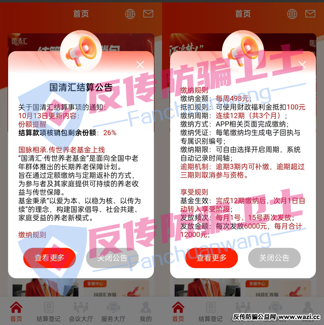 6、虚构 “国清汇” APP:冒充中国扶贫基金会、中国银行、中国平安资产公司名义,宣称是国家专项清算行动资产托管平台,每日听课领 6000 元结算补贴,连续签到领 138 万元,需缴纳费用办理会员购买 “结算款项核销包”。