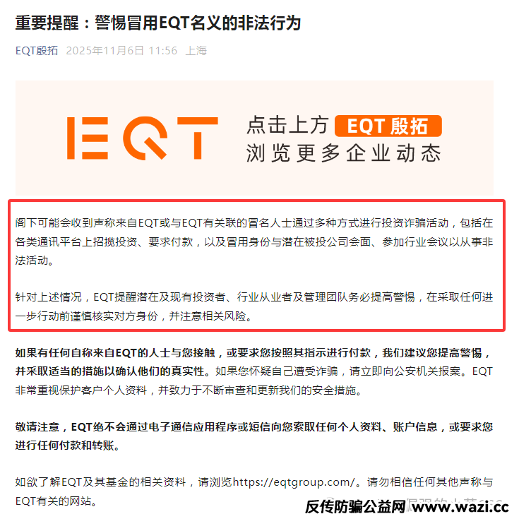 重点来了:殷拓集团(EQT)从未在中国设立任何面向个人的理财子公司,也从未推出过“EQT财富计划”这类高息投资项目。虽然官方尚未发布中文辟谣声明,但国内外多个反诈平台已明确核实:所有打着“EQT”名义拉人头、搞APP、推高回报理财的,统统是冒牌货!正版EQT业务只做B2B——企业并购、IPO支持、产业整合,根本不碰个人资金池,更没有所谓“专属理财APP”。那些平台上展示的“EQT授权文件”“国际监管牌照”全是PS的,连团队简历都是东拼西凑的网图。