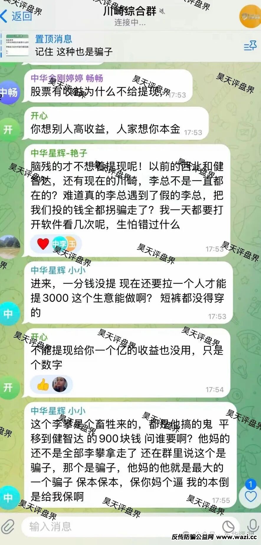 昊天评盘界:昨日不少受害者联系昊天让昊天曝光下一个叫川崎资管的股票跟单类资金盘骗局,这个骗子第一次割之前昊天就预警过了,还有一群傻x来骂昊天,现在第三次收割已经结束,又准备平...