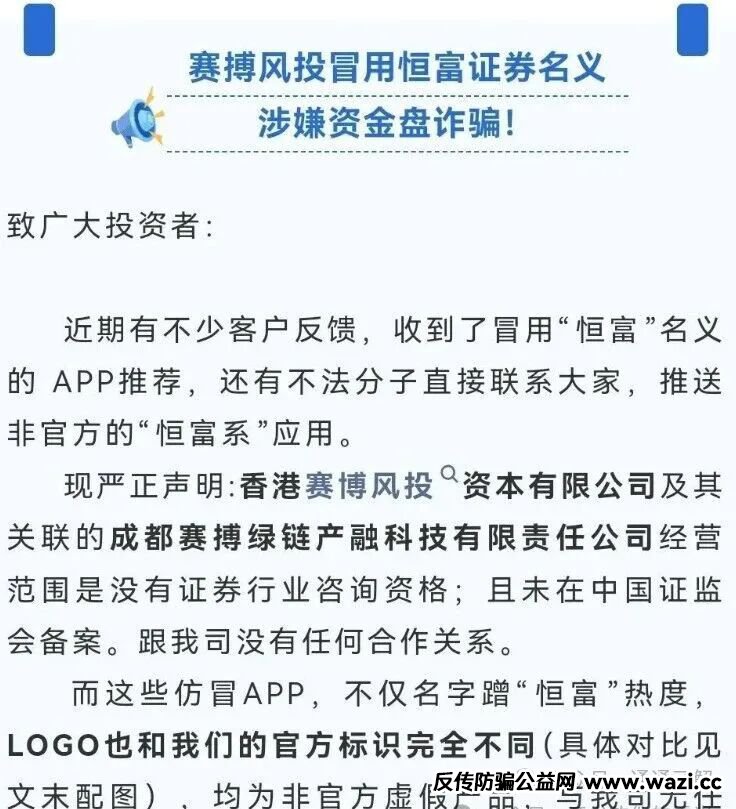 然而,恒富证券官方已发布严正声明,指出有不法分子假冒「恒富證券」名义,通过虚假手机应用程序(APP)进行诈骗活动。该虚假APP盗用公司官方标志,但实际内容与公司无关。