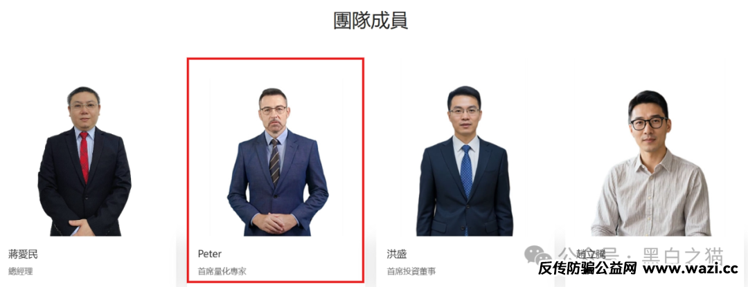 “华腾星寰”的项目网站内容经不起查询,小编就以官网上标注的团队成员进行甄别,给大家演示这种图像用AI模型识别很容易,就拿项目官网上团队核心成员Peter首席量化专家来说;