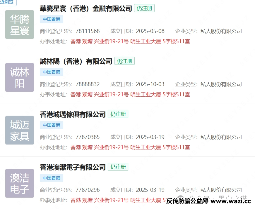 注册地址为香港觀塘興業街19-21號明生工業大廈 5字樓511室,这个地址也是香港中晟秘书服务有限公司的联系地址。
