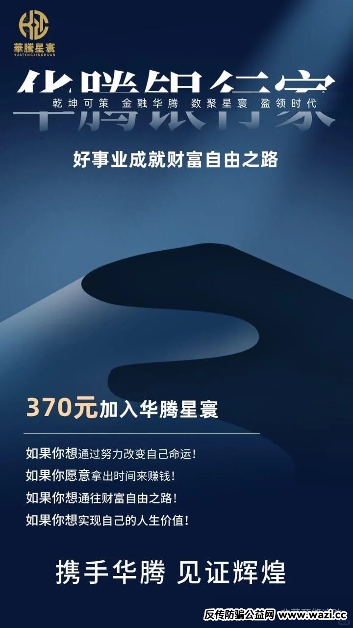 华腾星寰是典型资金盘骗局。其充值APP华腾星寰和聊天软件华腾星联,下载链接、服务器等涉及多家异常公司。以分红盘模式吸引参与者,团队发展分职级,拓展有多层收益,支持USDT充值。该项目线下通过注册、更名、过户公司完成布局;注册地址是共享办公室,有众多公司注册;其白皮书标注的团队成员头像AI生成,所谓受香港7大监管机构监管也无记录。投资者务必提高警惕,避免财富受损。