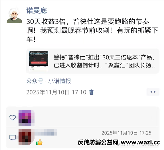 早在11月小诺就在微信朋友圈和公众号多次提醒“普徕仕”要崩盘了。很多人不以为然还在追加投资,提现复投。