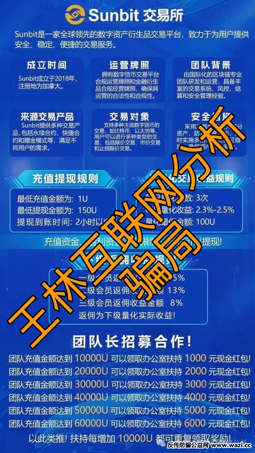 聚通交易所骗局 正式宣布崩盘跑路了,目前维权中,操盘手已经开新盘继续割韭菜了... Sunbit交易所骗局 合约跟单类资金盘骗局,典型的一轮圈杀猪盘,看见一定要远离! 贸易玩嘉跨境物流骗局...