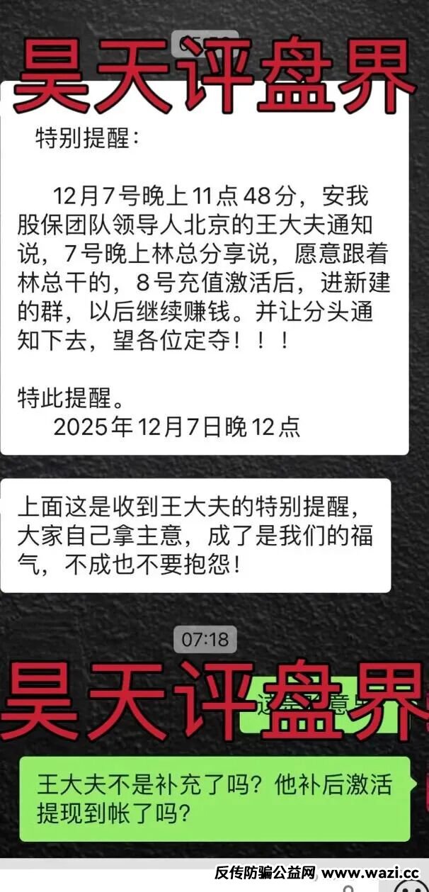 据受害者爆料,7号晚上不少会员已经被平移去新盘了,新盘后面昊天还会专门曝光,发布的内容如下:特别提醒:12月7号晚上11点48分,安我股保团队领导人北京的王大夫通知说,7号晚上林总分享说,愿意跟着林总干的,8号充值激活后,进新建的群,以后继续赚钱。并让分头通知下去,望各位定夺!!!特此提醒 2025年12月7日晚12点,这是准备第三次收割,竟然还有傻子信...