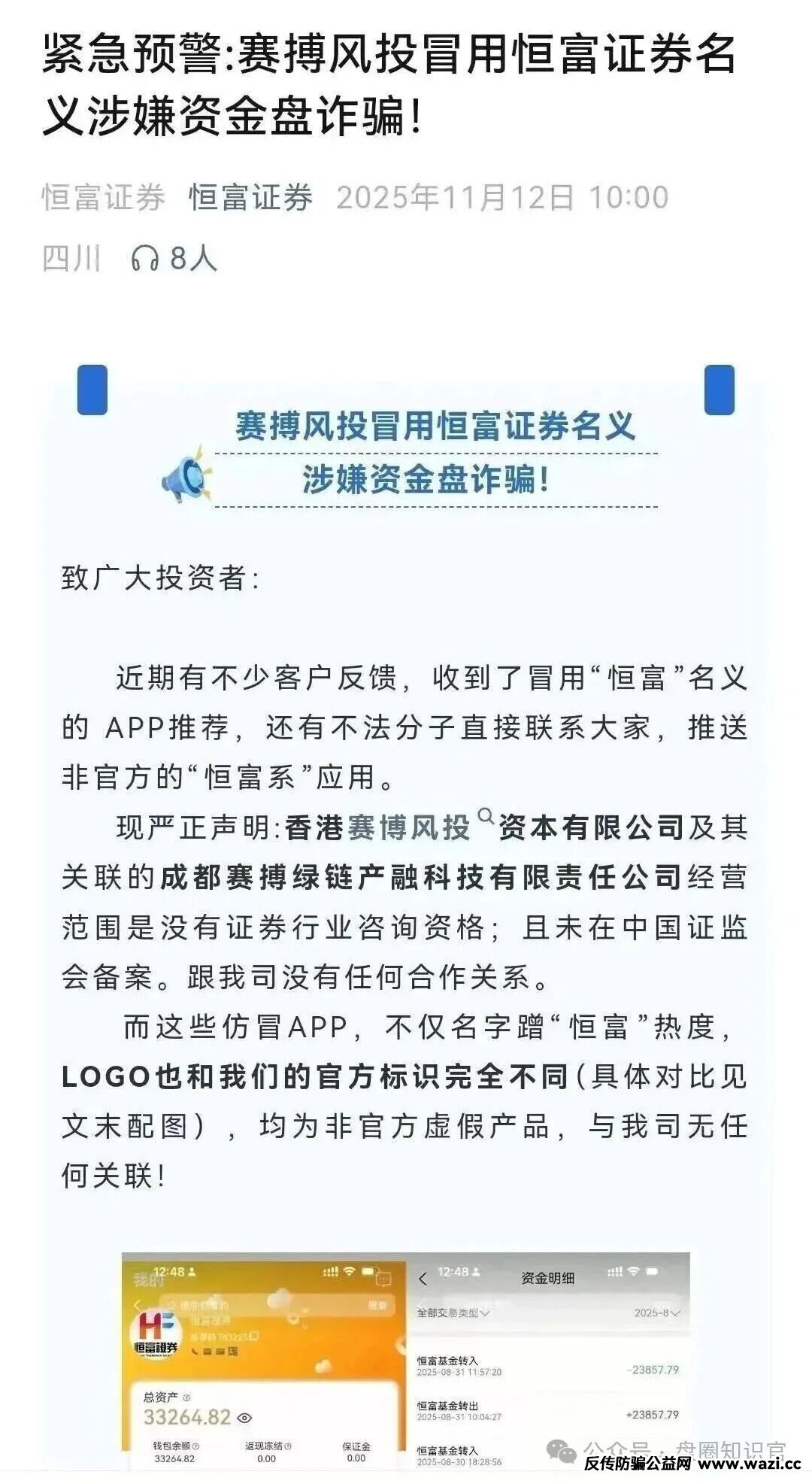 当“45 天回本”“日息最高 10%”的投资承诺摆在面前,你是否会心动?近期,名为 “赛搏风投”(冒用 “恒富证券” 名义)的股票带单类资金盘骗局正式崩盘,数亿资金被套,超 7 万名投资者从 “暴富梦” 跌入 “维权难” 的现实深渊,这场精心设计的骗局,再次给所有投资者敲响了警钟。