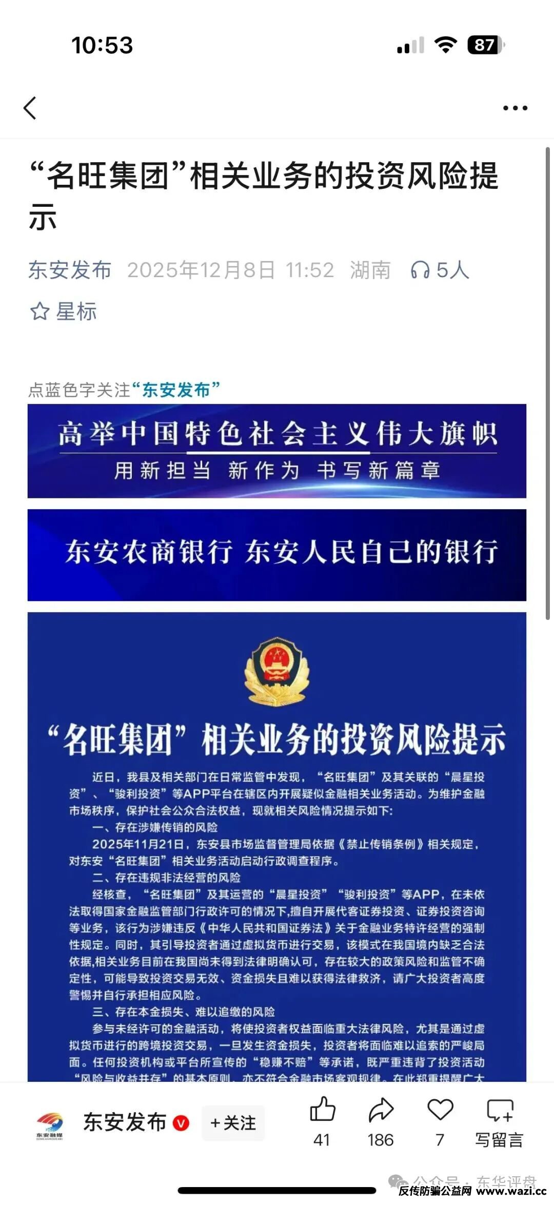 昊天评盘界:名旺集团股票跟单类资金盘骗局,也叫骏利投资,晨星投资,这个盘昊天之前也是预警过2次,据受害者爆料今天彻底崩盘跑路了,诈骗团伙让受害者缴纳8%验证金继续二次收割,已经被调查中,千万别交!老王给出的崩盘理由还是老套路:尊敬的合作伙伴及平台用户:为提升平台运行质量,确保账号使用规范化、降低系统风险,并符合本公司一贯秉持的审慎管理原则,我司将自即日起对全部平台账号进行一次例行核查(Routine AccountGovernance Review)。近期在系统审计与内部排查中,我们发现众多用户存在以下情况:使用多重账号登录或操作,借用他人身份证注册多个账号。一人持有数个甚至十几个账号,上下级之间私下传授“多号操作”方式这些行为不仅违反我司的运营规范,也直接影响团队结构、数据准确度及平台的健康发展。因此,经我司研究决定:即日起启动全平台统一账号治理,严格核查并规范所有账号使用。整顿重点包括:重复注册账号,多设备频繁登录且行为异常的账号,长期不活跃或资料不完整的账号,不符合规范的多号行为,核查流程将由助理与所有成员逐一确认,我们会秉承,公开、公平、合规、透明的原则。这崩盘理由是不是很熟悉?是的,全是一个骗局套路: