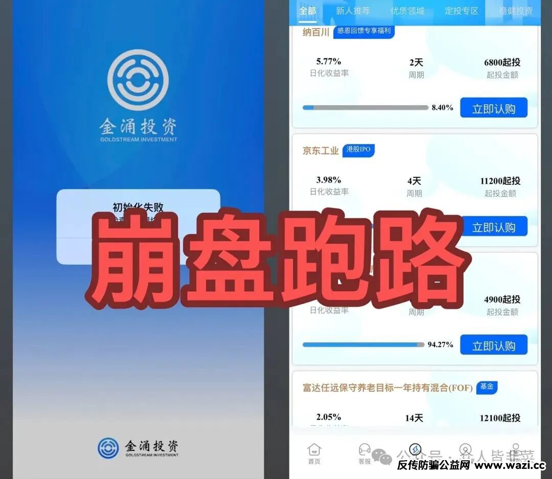 金涌投资,这个套牌骗局在凌晨关网跑路,前阵子就已经被爆出单割,跑路前也是狂出短期高利润产品,目的只为快速收割,你贪图短期高利,骗子想的是一网打尽。