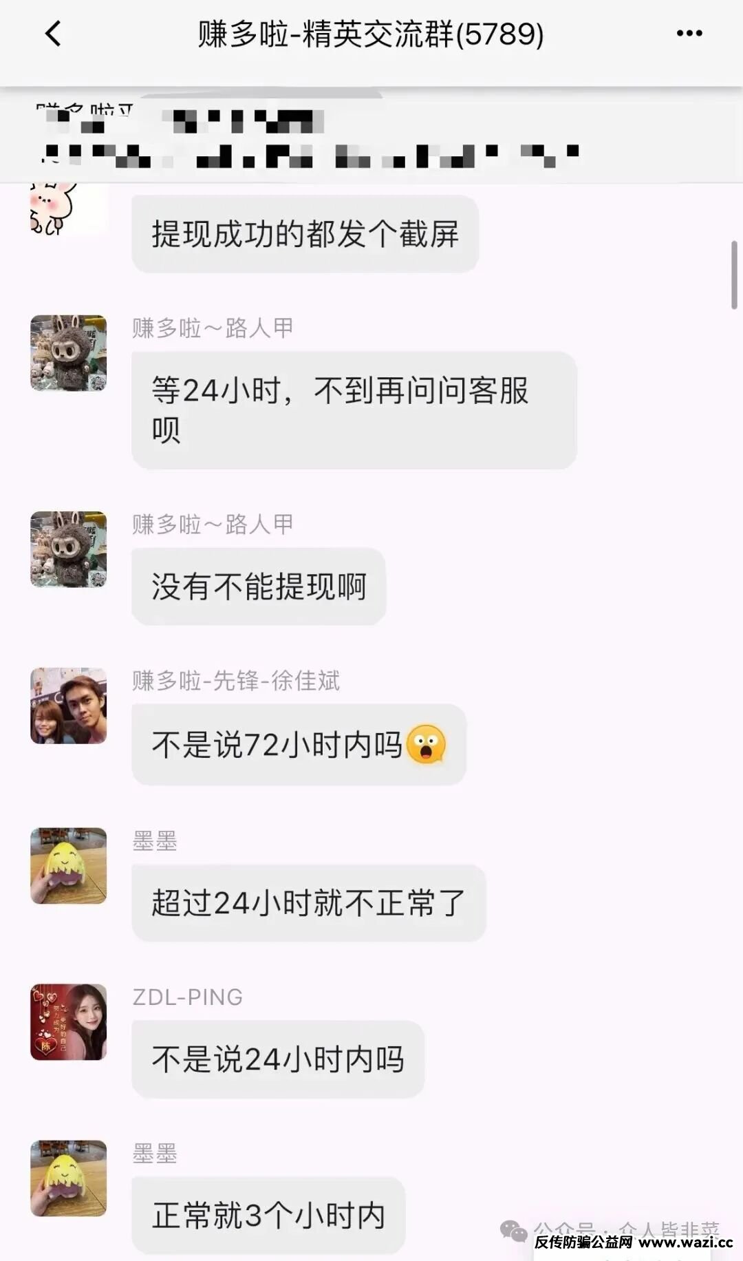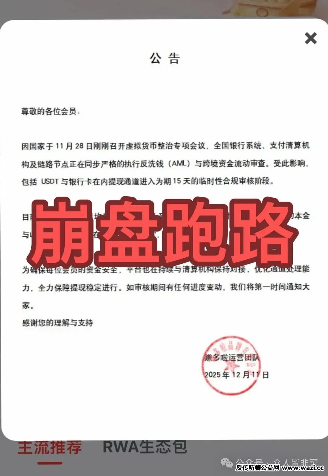 赚多啦,分红模式资金盘,昨天平台发布公告,因为受到一些影响,现在平台提现通道进入15天审核阶段,什么意思呢?意思就是骗子又随便找个借口,你就提不了现了,小编说过很多次,资金盘提现出问题,必跑,所以这个叫赚多啦的资金盘,也是宣布崩盘跑路。