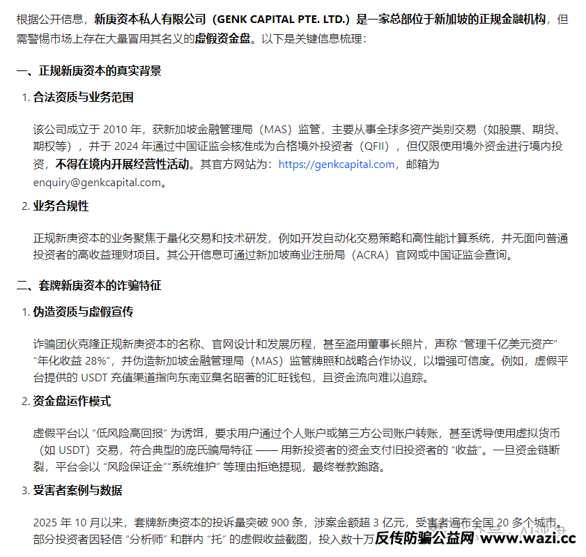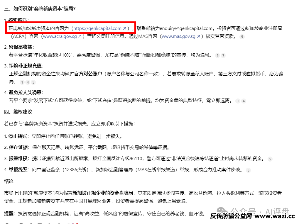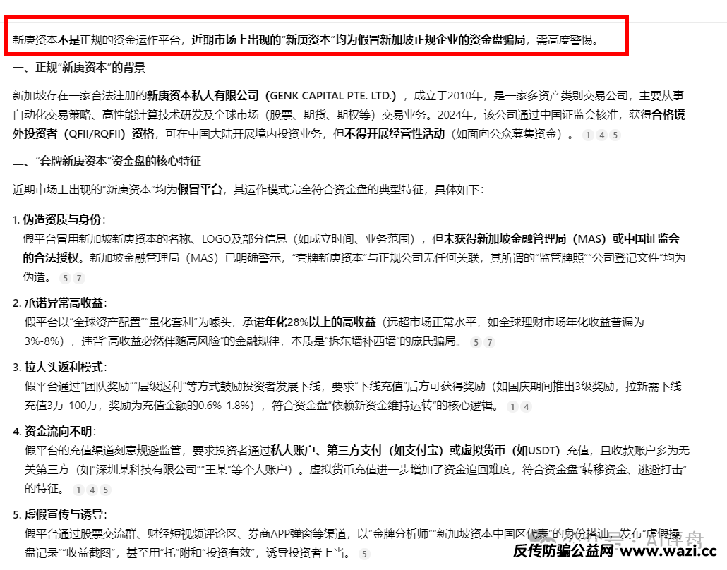 下面是今天的AI评盘内容:新庚资本是资金盘吗 一 百度AI: 百度一眼能知晓,新庚资本被假冒了,伪造网站,并且和正规的新庚资本有本质区别。 1 伪造监管文件;2 宣称日收益3%-10%;3 无实体 4...