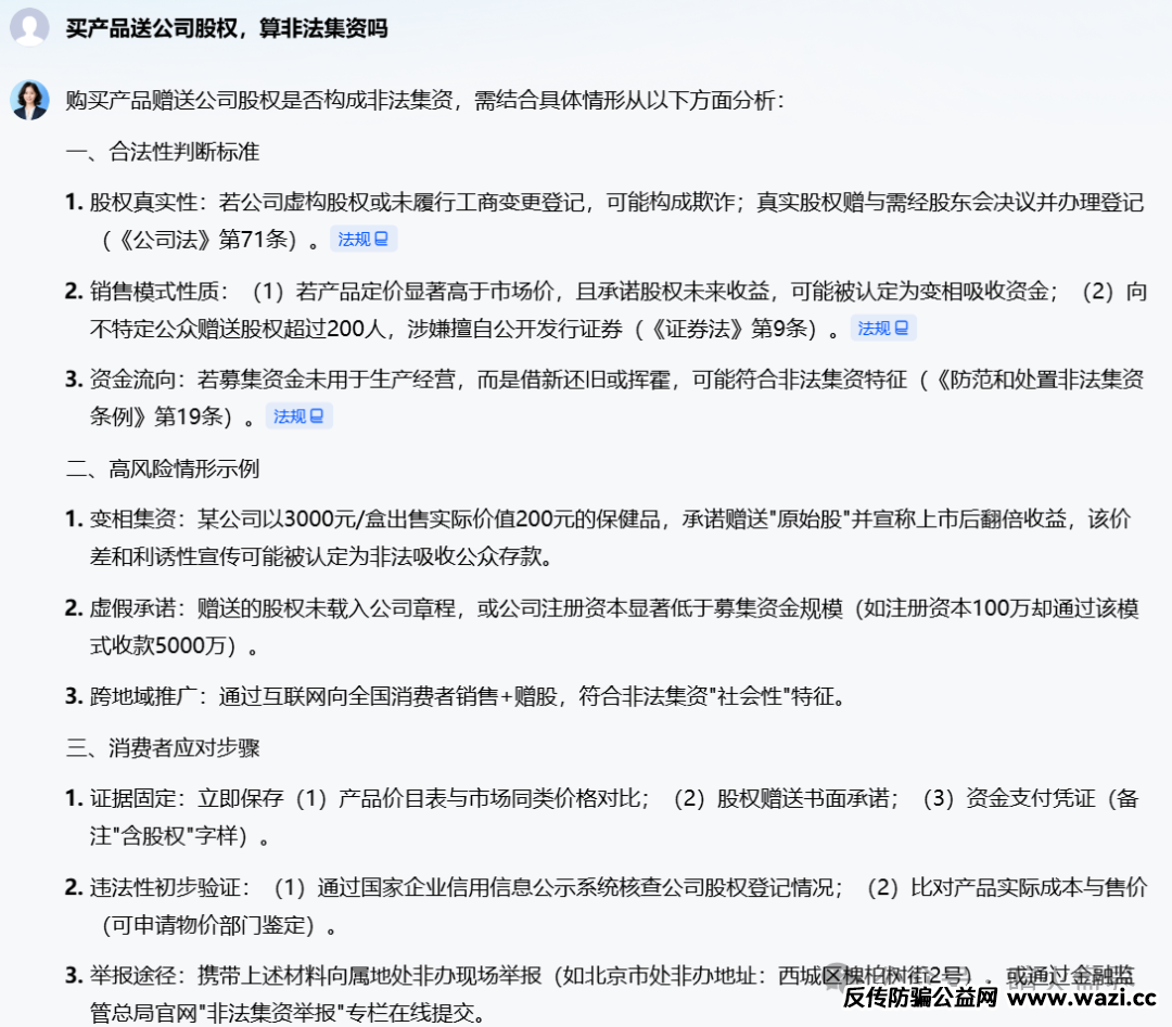 ·构成非法集资:如果产品价格远高于正常价值,实质是以“赠送股权”为诱饵向社会公众吸收资金,符合非法集资的“非法性、公开性、利诱性、社会性”特征,可能触犯《防范和处置非法集资条例》,涉及非法吸收公众存款罪等罪名。
