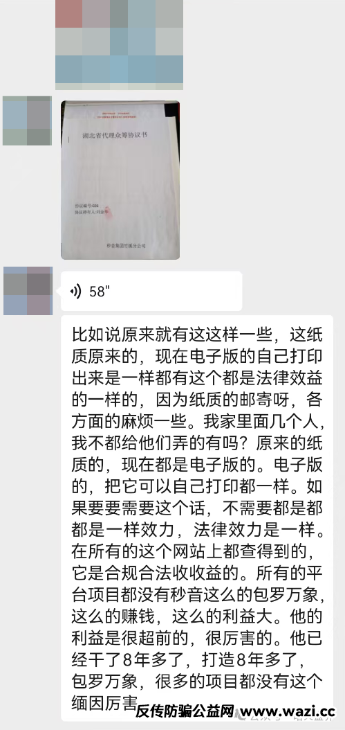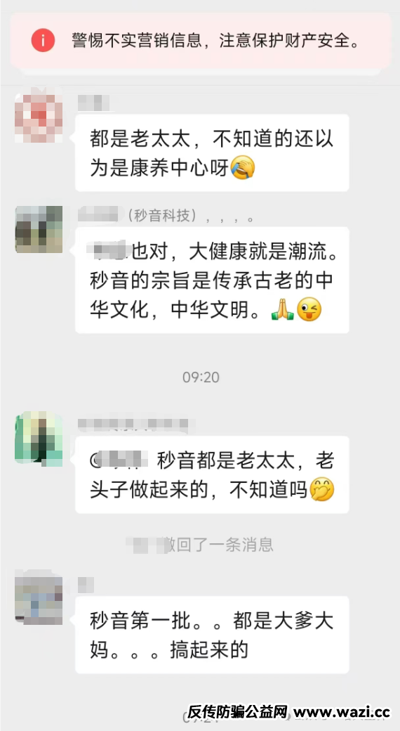 就在前些天一位粉丝向小诺透露关于“秒音”的新情况,其母亲在银行向秒音公司转账5万元意图购买该平台上销售的产品。银行工作人员问为什么向这家公司转账,其母亲说这家公司要上市了,现在买产品加入就送股权,上市后我把股权变现能赚很多钱。听到这样的说辞,银行的工作人员怀疑老人被网络资金盘洗脑,立刻向辖区派出所报案。派出所民警来到现场后详细了解了事情经过,老人向民警说明了秒音公司股权上市的情况。民警根据老人的说辞和秒音的宣传资料基本断定为涉诈、涉传公司。随后民警查询了老人最近几年的大额转账记录。看到其参与过众多网络资金盘项目。比如:雷达币、永倍达等。大家都知道这些项目都已经崩盘了。民警看到老人有多次被骗的经历,马上联系了其家人,也就是小诺的这位粉丝。向其说明情况后,并告知要求家人止付老人的全部银行卡、微信和支付宝账户。以保证老人在醒悟之前不再被此类骗局洗脑,最大限度的保护老人的财产和资金不受损失。