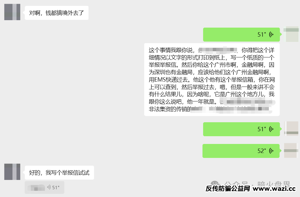 在秒音会员群里,有很多参与者直言不讳的说,秒音就是中老年人给推广起来的。没有老年人秒音这个项目也不会这么火!其实这话说的是事实,因为这么拙劣的操盘手法也骗不到年轻人。但是有很多年轻人的父母中招,所以小诺今天发文另外一个目的是为这一类粉丝指一条路。第一去当地派出所申请止付,先保护住父母的钱袋子。父母想花钱就花现金。这样能有效的减少被骗的概率。第二就是把小诺的文章发给他们看一看,尽量做到规劝,让老人自己醒悟过来。第三就是把父母参与投资的相关证据,以及微信群的聊天记录,相关讲课的视频和录音都保存好。把这些证据快递给广州市金融监督管理局举报信箱。记住要用中国邮政EMS邮寄,因为职能部门一般只收邮政的快递。或者直接电话举报也是可以的。