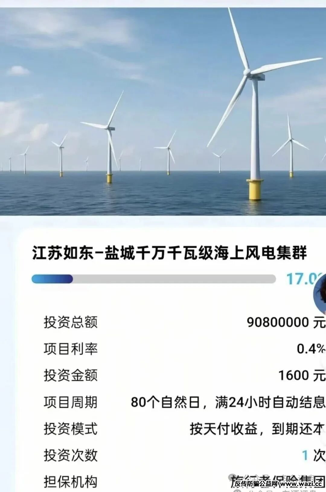 日利0.4%,月赚12%——听上去像印钞机成精了?可江苏如东、盐城那片海上的大风车,转得再猛,也转不出这种违背物理和金融规律的“神话利润”!其真相就为下方几类: 真相一:数学不会骗人,但骗子会玩弄数学 日息0.4%,复利滚一年,本金翻倍不止——请问哪家正经风电项目,利润率能跑赢毒品交易?真有这种暴利项目,盐城本地的资本巨鳄早就扑上去啃得骨头不剩,轮得到网络那头的“贵人”拉着你“共享红利”? 真相二:9800万?不,他们瞄准的是9800万个“一点点” 一个真正值钱的项目,从来不会像卖菜一样零散招揽“散户投资”。所谓“普惠金融”的皮囊下,藏的是精准算计:“骗一个人9800万很难,骗一万人每人9800块却很容易——毕竟,谁舍不得用一顿火锅钱赌一个‘财务自由梦’呢?” 真相三:你盯着利息,他们啃食的是你的本金 前三个月按时发“利润”?不过是拆东墙补西墙的经典庞氏演出。等你拉着亲戚朋友一起“上车”,便是幕布骤落的时候:项目方卷走“小钱”汇成的巨浪,而你手里只剩下一张电子版的“风电梦想认购书”——海风一吹,灰都不剩!!!